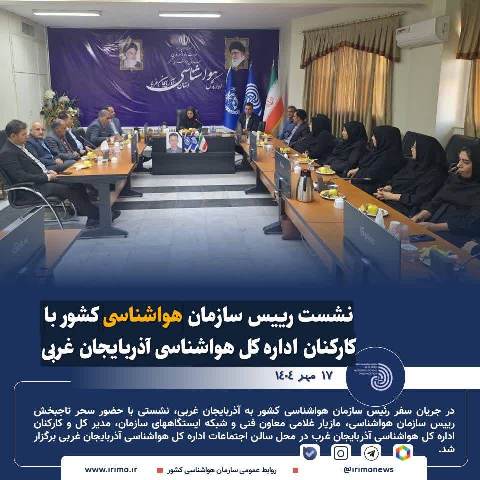 در جریان سفر رئیس سازمان هواشناسی کشور به آذربایجان غربی، نشستی با حضور سحر تاجبخش رییس سازمان هواشناسی، مازیار غلامی معاون فنی و شبکه ایستگاههای سازمان، مدیر کل و کارکنان اداره کل هواشناسی آذربایجان غربی در محل سالن اجتماعات اداره کل هواشناسی آذربایجان غربی برگزار شد.