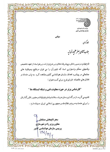 در شصتمین نشست شورای مدیران هواشناسی، برترین های هواشناسی کشور در ستاد و استان معرفی و با اهدای لوح از سوی مقام عالی سازمان از آنها تقدیر به عمل آمد.به گزارش روابط عمومی اداره کل هواشناسی به نقل از روابط عمومی سازمان هواشناسی کشور، شصتمین نشست شورای مدیران هواشناسی کشور روز سهشنبه 2 اسفند 1401 با حضور دکتر مهرداد بذرپاش، وزیر راه و شهرسازی، دکتر سحر تاجبخش معاون وزیر و رئیس سازمان هواشناسی کشور، معاونین و مدیران ستادی و مدیران 31 اداره کل هواشناسی استانی در سازمان مرکزی برگزار شد. در کنار این نشست یک روزه و با نتیجه ارزیابی های به عمل آمده، نفرانت برتر در سطح ستاد و استان معرفی و با اهدای لوح سپاس از سوی دکتر سحر تاج بخش معاون وزیر راه و شهرسازی و رئیس سازمان هواشناسی کشور تقدیر شدند. که در میان آن ها جعفر علیپور قره تپه دیدبان استان آذربایجان غربی نیز بعنوان کارشناس برتر در حوزه معاونت فنی و شبکه ایستگاه ها انتخاب گردید.این موفقیت را به ایشان و خانواده هواشناسی استان آذربایجان غربی تبریک عرض می نماییم.